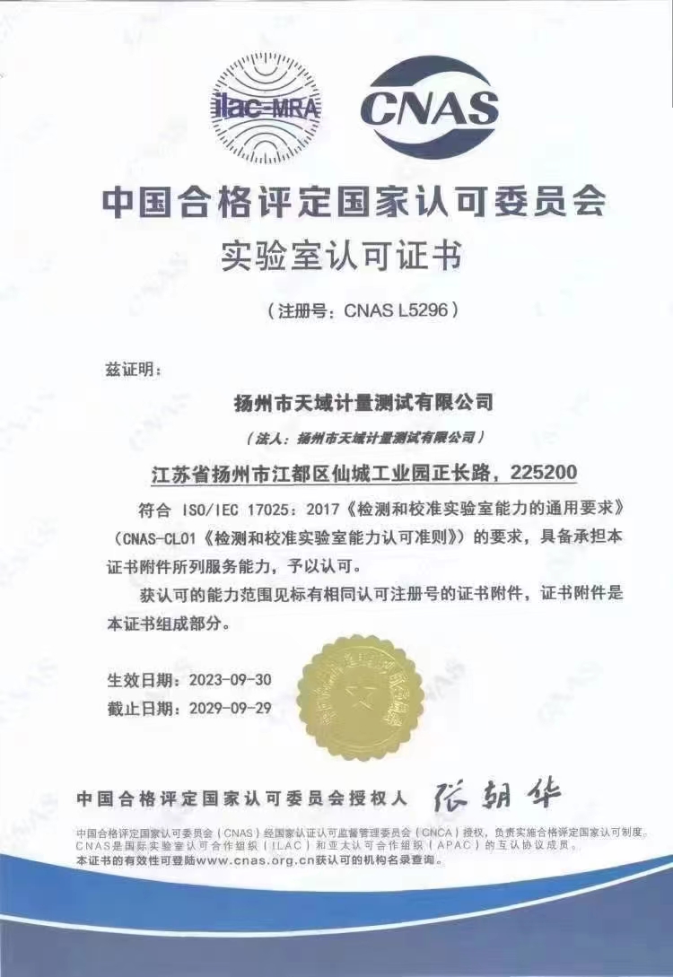 揚(yáng)州市天域計量測試有限公司,坐落在交通便利的揚(yáng)州市江都區(qū)仙城工業(yè)園,成立于2010年10月,2011年11月正式獲取中國合格評定國家認(rèn)可委員會認(rèn)可(授權(quán)),注冊號:CNAS L5296。近幾年的發(fā)展,實(shí)驗(yàn)室已具備了較大規(guī)模,并形成了集計量器具檢測,計量技術(shù)咨詢和計量器具銷售為一體的專業(yè)化技術(shù)機(jī)構(gòu),客戶覆蓋蘇南、蘇北、和浙江,安徽部分地區(qū),客戶群總量達(dá)到了上千家企事業(yè)單位。實(shí)驗(yàn)室建立健全了一套較為完整的內(nèi)外部質(zhì)量管理體系,至今未發(fā)生糾紛和客戶投訴事件。